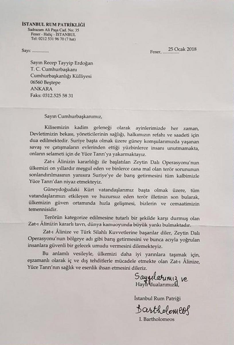Ευχόμαστε επιτυχία στην εξοχότητα σας και στις Τουρκικές Ένοπλες Δυνάμεις, ενώ ευχόμαστε η επιχείρηση Κλάδος Ελαίας όπως υποδηλώνει και το όνομα της, να φέρει ειρήνη στην περιοχή και να αποτελέσει μια ελπίδα ασφαλούς μέλλοντος για τους ζυμωμένους με τόσους πόνους ανθρώπους.