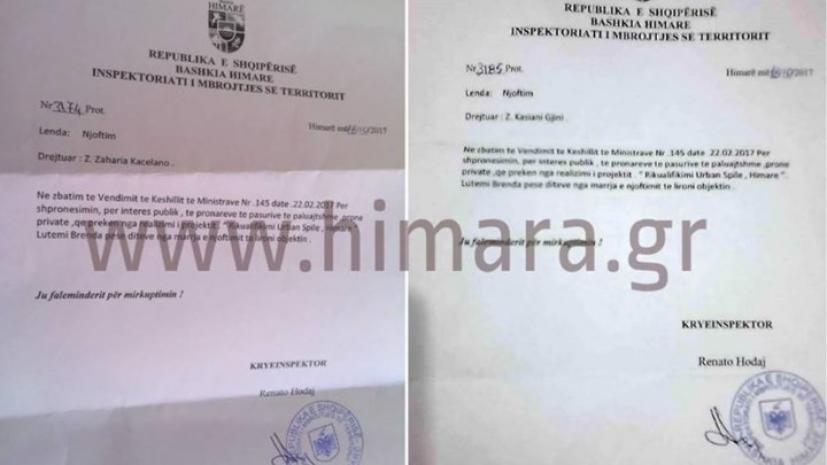Συνεχίζονται οι αλβανικές προκλήσεις στην ελληνική μειονότητα της Χειμάρρας. Όπως αναφέρει το himara.gr, το οποίο βασίζεται σε καταγγελίες μελών της μειονότητας, η επιθεώρηση χωροταξίας του Δήμου Χειμάρρας απέστειλε ειδοποιητήρια σε 19 οικογένειες Βορειοηπειρωτών να εγκαταλείψουν τα σπίτια τους εντός πέντε ημερών, λόγω σχεδίων για κατεδάφισή τους.