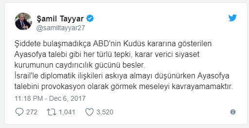 Έγραψε ο Ταγιάρ στο twitter: «Ας αρχίσουμε κι εμείς να ανοίγουμε την Αγία Σοφία τις Παρασκευές για προσευχή. Και άσε τους να παίζουν μετά την Τrumpέτα».