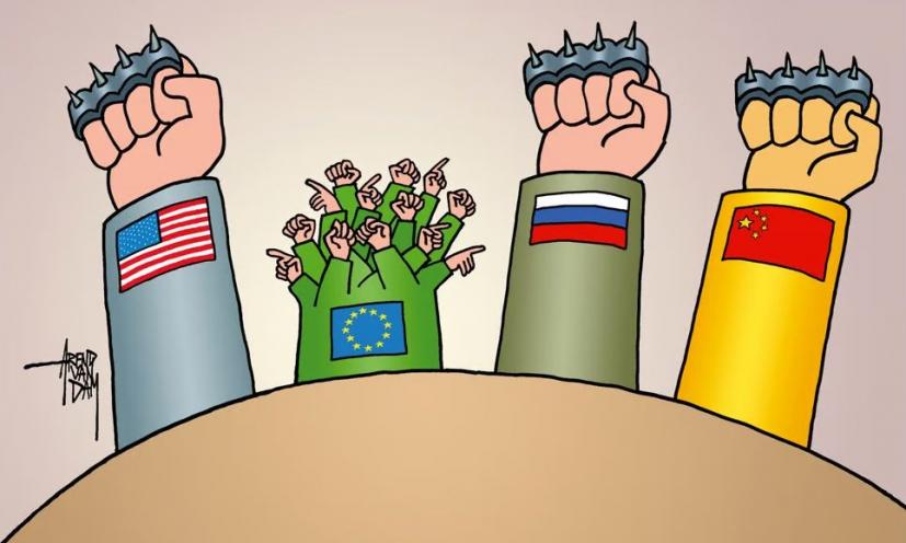Αντίστοιχα, ο Άρεντ βαν Νταμ αποτυπώνει στο σκίτσο του την Αμερική, τη Ρωσία και την Κίνα. Οι τρεις χώρες εμφανίζονται με σιδηρογροθιά, ενώ η Ευρώπη με πλήθος χεριών, που παραπέμπει στη Λερναία Ύδρα.