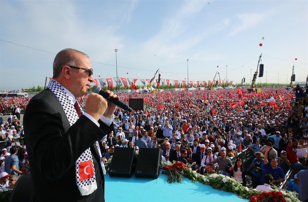 Απευθυνόμενος σε χιλιάδες υποστηρικτές του που κρατούσαν τουρκικές και παλαιστινιακές σημερίας στη συνοικία Γενίκαπι της Κωνταντινούπολης, ο Ερντογάν κάλεσε τους μουσουλμάνους να επιδείξουν αλληλεγγύη και είπε ότι τα Ηνωμένα Έθνη έχουν απολέσει τη νομιμότητά τους καθώς δεν κατάφεραν να ορθώσουν το ανάστημά τους απέναντι στις ΗΠΑ.