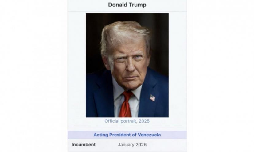 Ο πρόεδρος των Ηνωμένων Πολιτειών, Ντόναλντ Τραμπ, ανήρτησε στον λογαριασμό του στα μέσα κοινωνικής δικτύωσης εικόνα στην οποία εμφανίζεται ως «εν ενεργεία Πρόεδρος της Βενεζουέλας» (Acting President of Venezuela). Η ανάρτηση, που δημοσιεύτηκε στην πλατφόρμα Truth Social, περιλάμβανε μια ψηφιακά επεξεργασμένη εικόνα, στην οποία ο Τραμπ παρουσιαζόταν στον συγκεκριμένο ρόλο, στον απόηχο των πρόσφατων εξελίξεων στη Βενεζουέλα. Η εικόνα έμοιαζε με επεξεργασμένη σελίδα της Wikipedia, όπου ο Ντόναλντ Τραμπ εμφανιζόταν ως εν ενεργεία πρόεδρος της χώρας από τον Ιανουάριο του 2026. Η ανάρτηση έγινε σε κλίμα έντασης, μετά τη στρατιωτική επέμβαση των Ηνωμένων Πολιτειών στη Βενεζουέλα, κατά την οποία συνελήφθησαν ο πρόεδρος της χώρας Νικολάς Μαδούρο και η σύζυγός του, Σίλια Φλόρες, και μεταφέρθηκαν στις ΗΠΑ. Σύμφωνα με το δίκαιο της Βενεζουέλας, μετά την απομάκρυνση του Μαδούρο, η αντιπρόεδρος Ντέλσι Ροντρίγκες ορκίστηκε προσωρινή πρόεδρος της χώρας από το Ανώτατο Δικαστήριο. Ο Νικολάς Μαδούρο αντιμετωπίζει κατηγορίες σε ομοσπονδιακό δικαστήριο των Ηνωμένων Πολιτειών, που σχετίζονται με διακίνηση ναρκωτικών και άλλες εγκληματικές δραστηριότητες, όπως ανακοίνωσε το αμερικανικό υπουργείο Δικαιοσύνης.