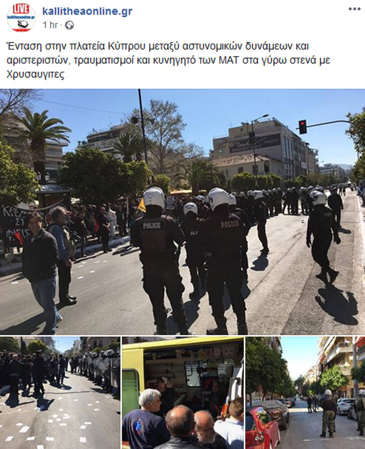 Στο μεταξύ, σε ανακοίνωσή του το ΚΚΕ «καταγγέλλει την απρόκλητη επίθεση των ΜΑΤ στην Καλλιθέα, κατά τη διάρκεια προσπάθειας σωματείων και φορέων της περιοχής, να εμποδίσουν τους ναζιστές της Χρυσής Αυγής, που επιχείρησαν να πάρουν μέρος στον εορτασμό της 25ης Μαρτίου, εμφανιζόμενοι να χαιρετούν ναζιστικά και να φωνάζουν εμετικά φασιστικά και αντικομμουνιστικά συνθήματα.