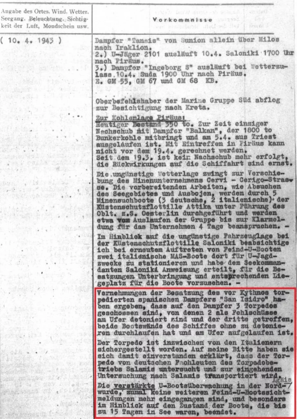 «09:32 Πολεμική έγερσις. Χειρίζομεν προς επίθεσιν. 10:00 Βάλλονται 3 τορπίλλαι εις απόστασιν 400 μέτρων 2 των οποίων τα ίχνη διασταυρώνουν καταφανώς τον στόχον» αναφέρεται στην καταχώρηση του ελληνικού υποβρυχίου.