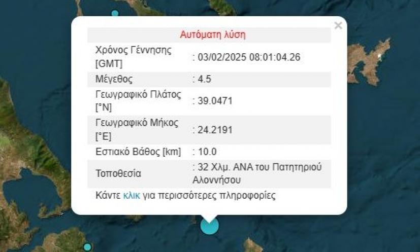 Σεισμός εντάσεως 4,5 Ρίχτερ με επίκεντρο την Αλόννησο σημειώθηκε στις 10:01 το πρωί της Δευτέρας (03/02), με τη δόνηση να γίνεται αισθητή και στην Αθήνα. Το επίκεντρο εντοπίζεται στα 32 χιλιόμετρα νότια – νοτιοανατολικά της Αλοννήσου, ενώ, το εστιακό βάθος του σεισμού υπολογίσθηκε στα 10 χιλιόμετρα, σύμφωνα με την αυτόματη λύση του Γεωδυναμικού Ινστιτούτου.