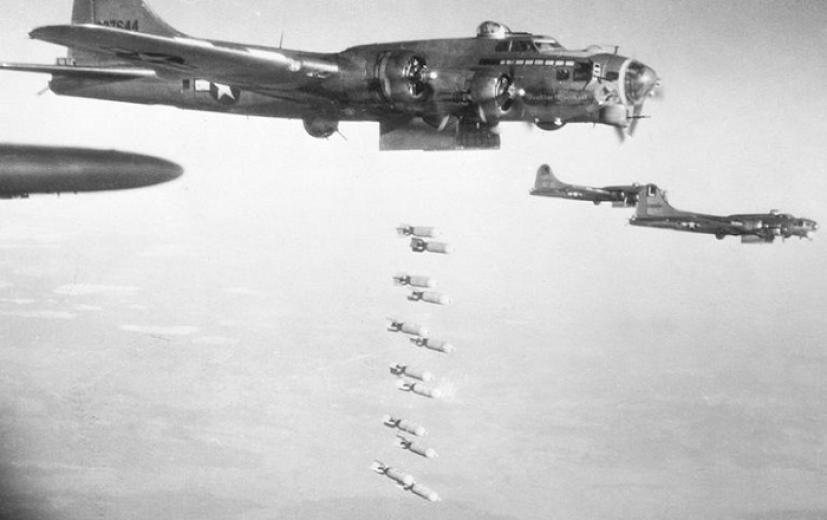 Ένα σμήνος από καμμιά τριανταριά Αγγλοαμερικανικά αεροπλάνα, όλα δικινητήρια, πετάν μεγαλόπρεπα σε σχηματισμό χήνας πάνω από τη πόλη κι ο πληθυσμός περήφανα και με κρυφό καρδιοχτύπι τα καμαρώνει και καρτεράει με κρυφή χαρά να φτάσουνε έγκαιρα στ’ αεροδρόμι των Ούννων και να τους γαζώσουνε κυριολεκτικά, μια και κυριάρχησαν στον αέρα πια.