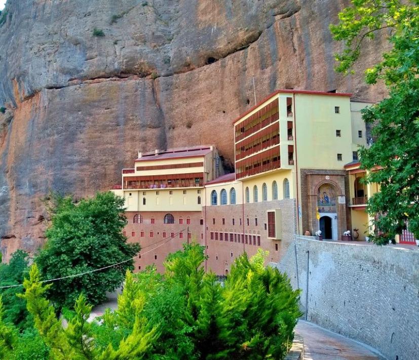 Κολλημένο πεισματικά σε ένα ευρύχωρο σπήλαιο (απ’ όπου και το όνομα του), στη βάση πελώριου, απειλητικού, κάθετου βραχώδους συγκροτήματος τού Χελμού σε υψόμετρο 940 μ., προκαλεί δέος και θαυμασμό με τη μοναδικότητα του.