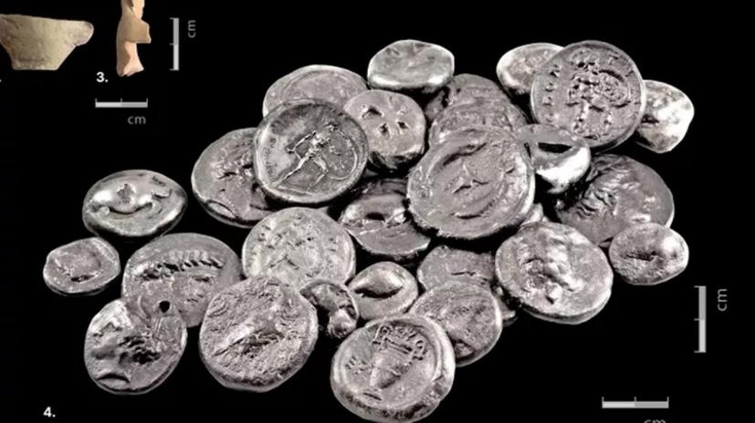 Εξαιρετικής αρχαιολογικής σημασίας και σπανιότητας είναι ο θησαυρός 29 αργυρών αρχαίων ελληνικών νομισμάτων (εικ. 2) που εντοπίστηκε μαζί με φορητό πήλινο βωμό, μικρογραφικό αγγείο και ειδώλιο ίππου με αναβάτη. Ο θησαυρός περιλαμβάνει νομίσματα που χρονολογούνται από τον ύστερο 6ο αι. π.Χ. μέχρι και τη δεκαετία του 330 π.Χ., πολλά εξ αυτών από τα σπανιότερα και πλέον ιστορικά νομίσματα της αρχαίας Ελλάδας.