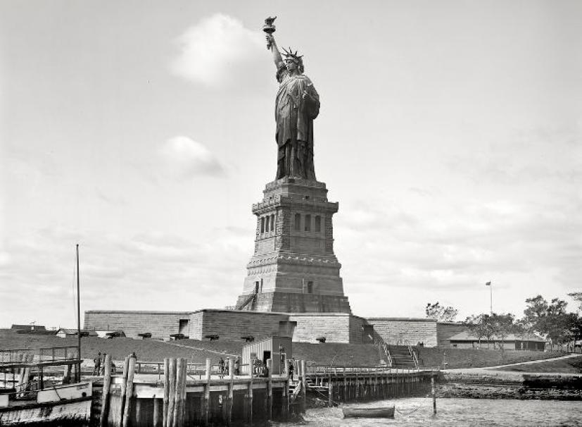Το Άγαλμα της Ελευθερίας είναι ίσως το πιο αναγνωρίσιμο σύμβολο στον κόσμο, το σύμβολο της ελευθερίας και του αμερικάνικου ονείρου, που επί 100 και πλέον χρόνια υποδεχόταν τα εκατομμύρια των μεταναστών που έφταναν στο Έλις Άιλαντ. Εμπνευστής του ήταν ο γάλλος ιστορικός Εντουάρ ντε Λαμπουλέ, που πρότεινε την κατασκευή του μετά τον αμερικανικό εμφύλιο, προς τιμήν της γαλλοαμερικανικής φιλίας. Οι Γάλλοι έπρεπε να φροντίσουν για το άγαλμα και οι Αμερικανοί για τη βάση του. Το 1874, ο Φρεντερίκ Μπαρτολντί, έμπειρος γλύπτης σε κατασκευές μνημείων, άρχισε να εργάζεται στο Παρίσι με τη χρηματοδότηση ενός γαλλοαμερικανικού ιδρύματος, ενώ τη στατική δομή του μελέτησε ο Γκιστάβ Άιφελ. Δέκα χρόνια αργότερα, το άγαλμα ολοκληρώθηκε και στη συνέχεια αποσυναρμολογήθηκε σε 350 κομμάτια για να σταλεί ατμοπλοϊκώς στη Νέα Υόρκη, όπου τοποθετήθηκε -κατόπιν απόφασης του αμερικάνικου κογκρέσου- στην είσοδο του λιμανιού, στη νησίδα Μπελντόε, που σήμερα ονομάζεται Λίμπερτι Άιλαντ. Τα εγκαίνιά του έγιναν στις 28 Οκτωβρίου του 1886. Το Άγαλμα της Ελευθερίας ζυγίζει 225 τόνους και καλύπτεται από ένα περίβλημα χαλκού. Το ύψος του χωρίς τη βάση είναι 46,5 μέτρα, ενώ με τη βάση διπλασιάζεται. Στο εσωτερικό του, 168 σκαλιά επιτρέπουν την άνοδο στο κεφάλι και άλλα 54 στο χέρι, που κρατάει τον πυρσό. Από το 1972 η βάση του Αγάλματος της Ελευθερίας φιλοξενεί το Μουσείο Μετανάστευσης, που είναι αφιερωμένο στην ιστορία της μετανάστευσης στις ΗΠΑ. Η επιγραφή στην είσοδο γράφει: