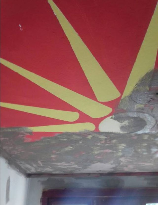 Συγκεκριμένα, τα σύμβολα του μακεδονισμού, όπως ο «Ήλιος της Βεργίνας», ξύθηκαν και καλύφθηκαν.