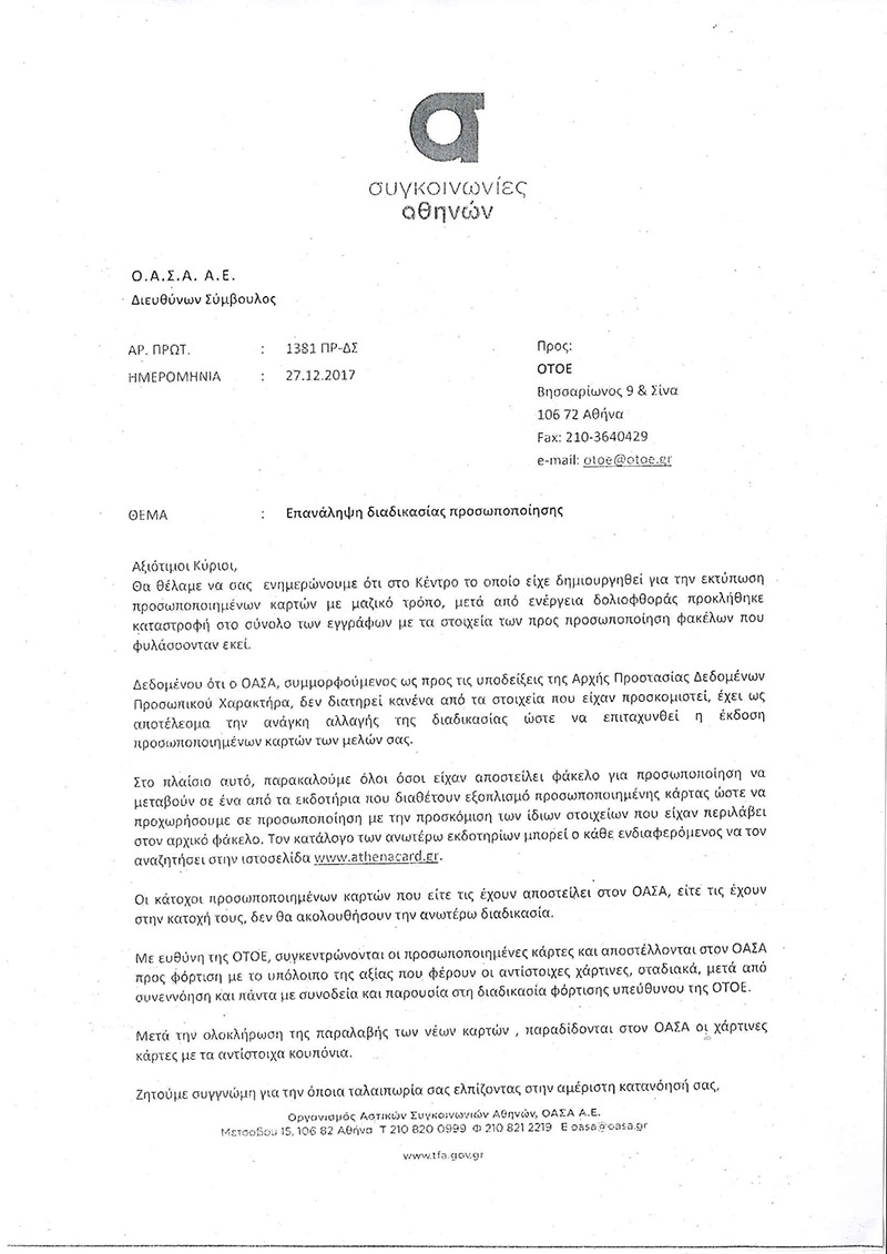 Πρόκειται για στοιχεία που είχαν αποσταλεί σε φακέλους στον Οργανισμό από την ΟΤΟΕ, αλλά και άλλους επαγγελματικούς φορείς, για μαζική έκδοση καρτών, ενημέρωσε ετεροχρονισμένα (στις 27 Δεκεμβρίου) το σωματείο των τραπεζοϋπαλλήλων η διοίκηση του ΟΑΣΑ.