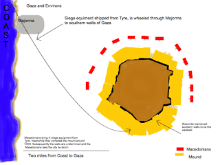 Η πρόσχωση ήταν τόσο ψηλή, που οι μηχανοποιοί βεβαίωναν τον Αλέξανδρο ότι ήταν αδύνατη η προσβολή των τειχών. Ως την ώρα εκείνη η στρατιά του Αλεξάνδρου προέλαυνε αήττητη, είχε νικήσει τους αντιπάλους από μειονεκτική θέση και είχε αλώσει όλες τις πόλεις, που πολιόρκησε. Η ταχύτητα και η αποτελεσματικότητα της στρατιάς και οι ικανότητες του Αλεξάνδρου τρομοκρατούσαν τους εχθρούς και πειθαρχούσαν τους φίλους. Οι πειθαναγκασμένοι σε ηρεμία Έλληνες και κυρίως οι εξεγερμένοι Σπαρτιάτες δεν έπρεπε να δουν κανένα σημείο αδυναμίας του Αλέξανδρου, ούτε να βρουν συμμάχους και προγεφυρώματα στα πλευρά της στρατιάς του. Ο Αλέξανδρος γνώριζε ότι αν δεν καθυπέτασσε όλα τα παράλια της Ανατολικής Μεσογείου, δεν μπορούσε να προχωρήσει στο εσωτερικό της Ασίας. Το γεγονός ότι η Γάζα ήταν θεωρητικά απόρθητη, θα ενίσχυε τον αντίκτυπο της άλωσής της σε εχθρούς και συμμάχους. Έπρεπε λοιπόν να κυριευθεί! Στο μεταξύ οι Σύνεδροι των Ελλήνων στην Κόρινθο είχαν ψηφίσει να σταλεί 15μελής αντιπροσωπεία, για να μεταφέρει στον Αλέξανδρο χρυσό στεφάνι ως αριστείο από την Ελλάδα και να τον συγχαρεί για τη νίκη στην Ισσό. Η αντιπροσωπεία αυτή τον συνάντησε κατά την πολιορκία της Γάζας.