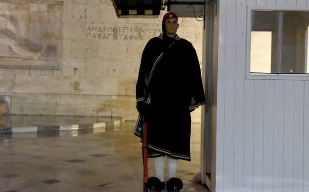 Το μόνο που τους προστατεύει από το κρύο και την βροχή είναι το σκέπαστρο της φρουράς. Ωστόσο, το κρύο ειδικά το βράδυ είναι τσουχτερό για αυτό και οι Εύζωνες φόρεσαν την μακριά κάπα της χειμερινής στολής τους.