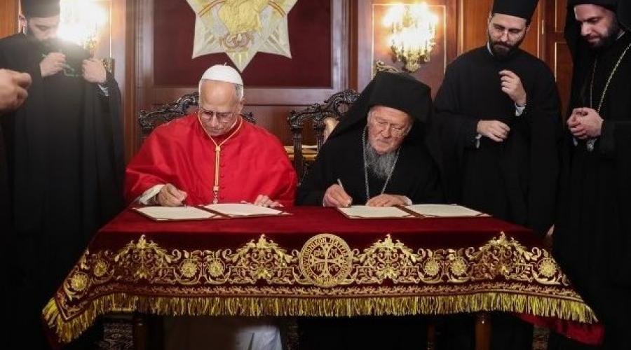 Κοινωνικά, αλλά και θεολογικά ζητήματα, περιλαμβάνει η κοινή διακήρυξη, την οποία υπέγραψαν νωρίτερα σήμερα στο Φανάρι ο Πάπας Λέων ΙΔ' και ο Οικουμενικός Πατριάρχης Βαρθολομαίος. Μετά τη Δοξολογία στον ναό του Αγίου Γεωργίου, ακολούθησε συνάντηση με τον Οικουμενικό Πατριάρχη Βαρθολομαίο και υπογραφή κοινής δήλωσης, αλλά και ανταλλαγή δώρων.