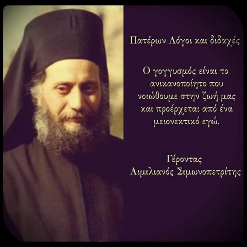 Γέροντας Αἰμιλιανὸς Σιμωνοπετρίτης: «Ο γογγυσμός είναι το ανικανοποίητο που νοιώθουμε στη ζωή μας και προέρχεται από ένα μειονεκτικό εγώ. Η ζήλεια προέρχεται από ένα εγώ υπερτροφικό, ενώ η εξουδένωση από ένα εγώ αυτοτρεφόμενο και αυτοδυναμούμενο άνευ Θεού, που βλέπει τον άλλον κατώτερο, μηδαμινό. Το μίσος είναι η διαφοροποίηση, η απώθηση του άλλου από την ύπαρξη μας».