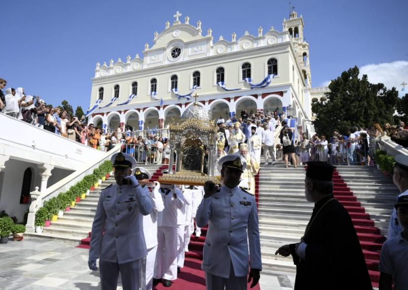 Λαμπρά και με την συμμετοχή χιλιάδων πιστών από όλο τον κόσμο η Τήνος τίμησε και εφέτος τη Μεγαλόχαρη με την κορύφωση των λατρευτικών εκδηλώσεων να πραγματοποιείται με τη λιτάνευση της ιεράς εικόνας της Παναγίας από το Ιερό Πανελλήνιο Προσκύνημα στην πλατεία Παντανάσσης, κοντά στο λιμάνι του νησιού. Μήνυμα ενίσχυσης της αποτρεπτικής ισχύος της Ελλάδας έστειλε στις δηλώσεις του από την Τήνο ο Yπουργός Άμυνας, Νίκος Δένδιας, ο οποίος εκπροσώπησε την κυβέρνηση στις τελετές για την 85η επέτειο του τορπιλισμού της «Έλλης». Το πρωί την Παρασκευής, 15 Αυγούστου 2025, τελέστηκε αρχικά η ακολουθία του Όρθρου και εν συνεχεία Αρχιερατικό συλλείτουργο στο οποίο προεξήρχε ο Μητροπολίτης Τρίκκης, Γαρδικίου και Πύλης κ. Χρυσοστόμου, συλλειτουργούντων των Μητροπολιτών Λαρίσης και Τυρνάβου κ. Ιερωνύμου, Σύρου κ. Δωροθέου, ιερέων και διακόνων.
