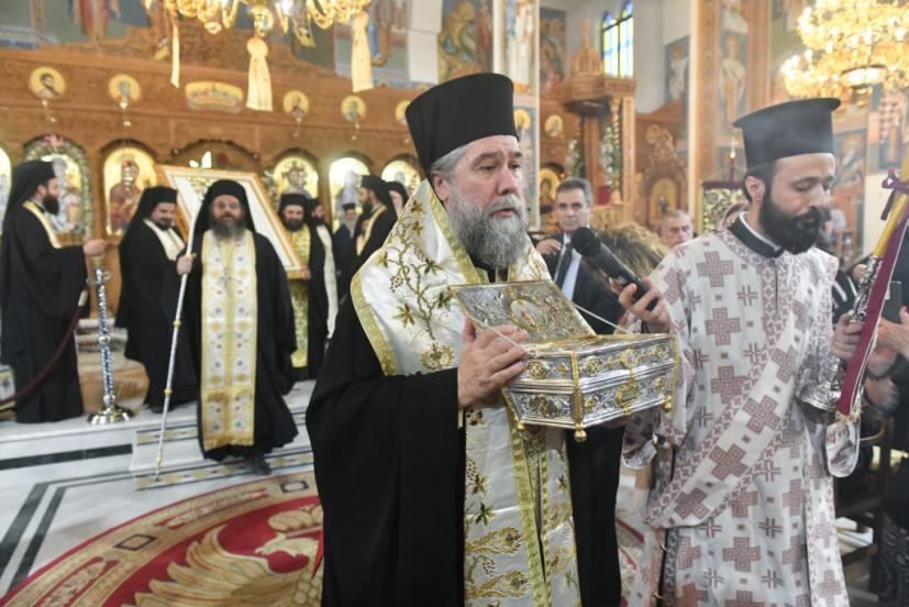 Στην συνέχεια, ο Πρόεδρος του Εκκλησιαστικού Συμβουλίου του ιερού Ναού, αιδεσιμολ. Πρωτοπρεσβύτερος π. Ιορδάνης Θεμελίδης, αναφέρθηκε στο ιστορικό γεγονός της ελεύσεως του ιερού λειψάνου, ευχαρίστησε δε υιϊκώς και καθηκόντως, για την πατρική επιστασία, το συνεχές ενδιαφέρον, την συνεχή και έμπρακτη, πνευματική μέριμνα και συνεισφορά του τον σεπτό Ποιμενάρχη κ. Θεολόγο, ο οποίος, για την κάλυψη των λατρευτικών και πνευματικών αναγκών των κατοίκων της περιοχής αυτής, έθεσε το έτος 2008 τον θεμέλιο λίθο, ενώ προ τετραετίας (6.6.2021) ετέλεσε την ακολουθία των λειτουργικών Εγκαινίων του ως είρηται ιερού Ναού.