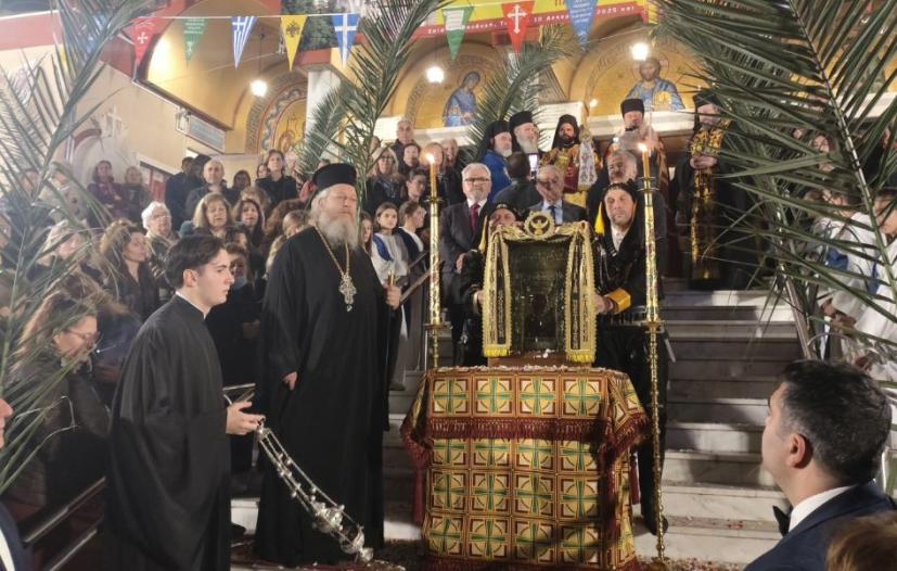 Η υποδοχή έγινε στην διασταύρωση των οδών Αχαρνών και Καυταντζόγλου, απ’ όπου εν πομπή η Εικόνα μεταφέρθηκε στον Ναό του Αγίου Ελευθερίου-οδού Αχαρνών.
