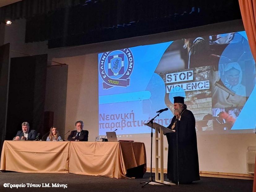 Ο Μητροπολίτης Μάνης κ. Χρυσόστομος Γ’ προσκληθείς τιμητικώς από την Διεύθυνση Αστυνομίας Λακωνίας παρέστη χθες, στην αίθουσα της Κεντρικής Βιβλιοθήκης Σπάρτης, στην εκδήλωση που διοργάνωσε η ως άνω υπηρεσία, υπό την διεύθυνση του Αστυν. Διευθυντού, Ταξιάρχου κ. Βασιλείου Τσιγαρίδη, με θέμα: «Νεανική παραβατικότητα – η σύγχρονη πρόκληση της κοινωνίας».