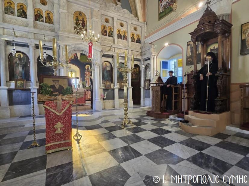 Στις 24 Αυγούστου 2025, Κυριακή ΙΑ΄ Ματθαίου και μνήμη του Αγίου Ιερομάρτυρος και Ισαποστόλου Κοσμά του Αιτωλού, Διδάχου του Γένους μας, ο Σεβ. Μητροπολίτης Σύμης κ. Χρυσόστομος χοροστάτησε στον Όρθρο και τέλεσε την Θεία Λειτουργία στον Ενοριακό Ι. Ναό του Αγίου Ελευθερίου Σύμης, με συλλειτουργούς του τον π. Γεώργιο Κακακιό και τον Ιεροδιάκονο π. Παύλο Τερεζάκη, ενώ το ι. Αναλόγιο διακόνησε γλυκυφθόγγως ο Ιεροψάλτης κ. Πανορμίτης Κακακιός. Προσήλθαν για να εκκλησιασθούν αρκετοί πιστοί, προς τους οποίους ο Σεβασμιώτατος, δραττόμενος της λατρευτικής ευκαιρίας, ομίλησε με αφορμή το ευαγγελικό ανάγνωσμα, αναφερόμενος στην παραβολή των μυρίων ταλάντων ή του ασπλάγχνου δούλου.