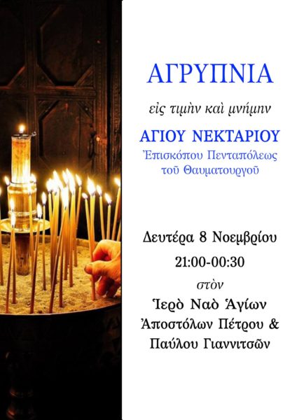 Την Δευτέρα 8 Νοεμβρίου, από ώρα 21.00 έως 0.30, στον Ιερό Ναό Αγίων Αποστόλων Πέτρου και Παύλου Γιαννιτσών θα τελεσθεί Αγρυπνία εις τιμήν και μνήμην του εν αγίοις πατρός ημών Νεκταρίου επισκόπου Πενταπόλεως του θαυματουργού.