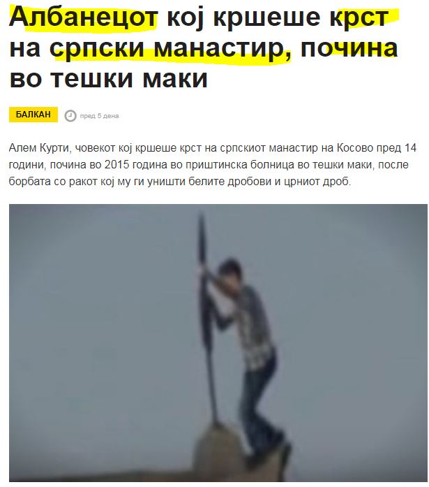 Ο Αλβανός Αλέμ Κούρτι, ο οποίος είχε σπάσει τον Σταυρό σε σερβικό μοναστήρι του Κοσσυφοπεδίου πριν από 14 χρόνια, πέθανε το 2015 στο νοσοκομείο της Πρίστινα μέσα από φοβερούς πόνους μαχόμενος με τον καρκίνο που τον χτύπησε στους πνεύμονες και το ήπαρ.