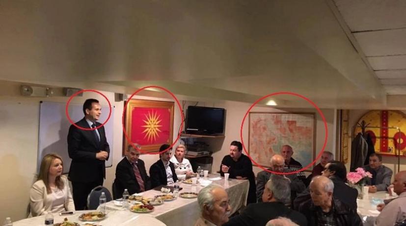 Σε «γκαλά» εθνικιστών συμπατριωτών του στις ΗΠΑ, όπου κυριαρχούν χάρτες της «Μεγάλης Μακεδονίας» και κόκκινες σημαίες με τον Ήλιο της Βεργίνας, συμμετέχει συχνά ο πρέσβης των Σκοπίων, Βάσκο Ναουμόφσκι και έως πρότινος επίσημος διαπραγματευτής για την ονομασία στον ΟΗΕ.