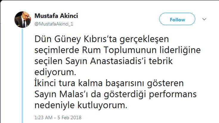 «Συγχαίρω τον κύριο Αναστασιάδη για την επανεκλογή του ως ηγέτης των Ελληνοκυπρίων στις χθεσινές εκλογές της νότιας Κύπρου. Επίσης, συγχαίρω τον κ. Μαλά για την προσπάθειά του στον δεύτερο γύρο», έγραψε ο Ακιντζί.