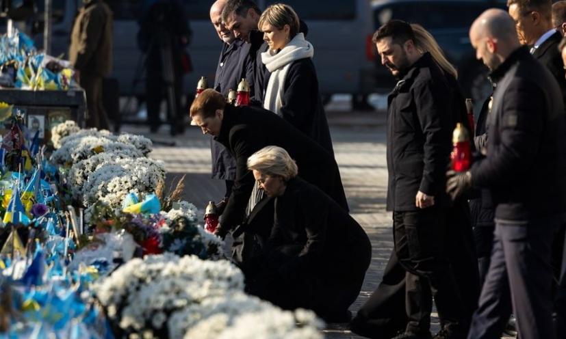 Σε κοινή δήλωσή τους, η πρόεδρος του Ευρωπαϊκού Κοινοβουλίου Ρομπέρτα Μετσόλα, ο πρόεδρος του Ευρωπαϊκού Συμβουλίου Αντόνιο Κόστα και η πρόεδρος της Ευρωπαϊκής Επιτροπής Ούρσουλα φον ντερ Λάιεν δήλωσαν ότι «σε ένα δύσκολο διεθνές και γεωπολιτικό περιβάλλον, τονίζουμε τη σημασία της διατήρησης της διατλαντικής και παγκόσμιας αλληλεγγύης προς την Ουκρανία». Αποτίοντας φόρο τιμής σε όσους έχασαν τη ζωή τους στη σύγκρουση και λέγοντας ότι «η Ρωσία και ο λαός της πληρώνουν το τίμημα για τις πράξεις του ηγέτη τους», αναφέρεται στην ανακοίνωση: Πριν από τρία χρόνια η Ρωσία ξεκίνησε τον ολοκληρωτικό και παράνομο επιθετικό πόλεμο εναντίον της Ουκρανίας. Ο βάναυσος πόλεμος της Ρωσίας στοχεύει σκόπιμα τον άμαχο πληθυσμό και τις κρίσιμες υποδομές. Η Ρωσία και η ηγεσία της φέρουν την αποκλειστική ευθύνη για αυτόν τον πόλεμο και τις φρικαλεότητες που διαπράχθηκαν κατά του ουκρανικού πληθυσμού. Συνεχίζουμε να ζητάμε την απόδοση ευθυνών για όλα τα εγκλήματα πολέμου και τα εγκλήματα κατά της ανθρωπότητας που διαπράχθηκαν. Η Ευρωπαϊκή Ένωση θα συνεχίσει να παρέχει στην Ουκρανία τακτική και προβλέψιμη οικονομική στήριξη, συμπεριλαμβανομένης της ανοικοδόμησης της χώρας μετά τον πόλεμο. Έχουμε λάβει πρωτοφανείς δράσεις σε επίπεδο ΕΕ για την αύξηση της παραγωγής της ευρωπαϊκής αμυντικής βιομηχανίας και θα συνεχίσουμε να αυξάνουμε την ικανότητά μας. Αυτό θα μας επιτρέψει να εντείνουμε τη στρατιωτική μας στήριξη και συνεργασία με την Ουκρανία, ενισχύοντας ταυτόχρονα την αμυντική μας ετοιμότητα και την ευρωπαϊκή κυριαρχία.