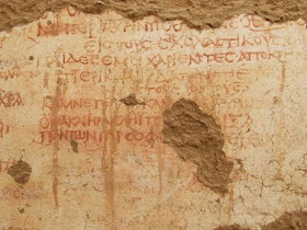παγκάκια όπου οι μαθητές θα μπορούσαν να κάθονται για να διαβάσουν , ή να σταθούν και να γράφουν στον πίνακα ; - χρονολογείται σε μια εποχή που η Ρωμαϊκή Αυτοκρατορία ελέγχει την Αίγυπτο και τα ελληνικά ήταν ευρέως διαδεδομένα .