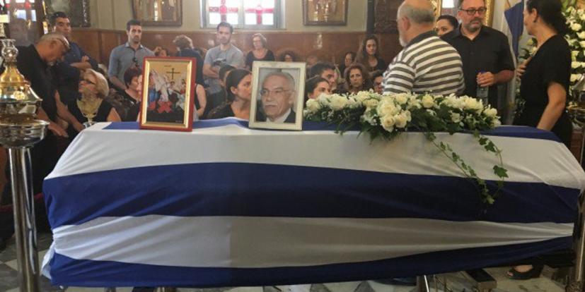 Το φέρετρο με τη σορό του Μανώλη Σκουλάκη ήταν σκεπασμένο με την ελληνική σημαία, ενώ στη μνήμη του κατατέθηκαν δεκάδες στεφάνια.