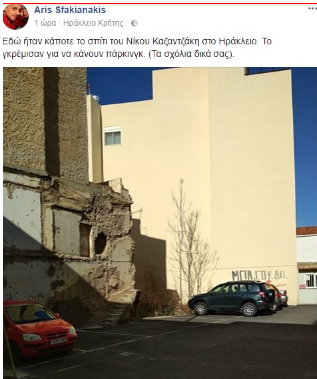Σύμφωνα με τον ίδιο γκρέμισαν το σπίτι του Νίκου Καζαντζάκη στο Ηράκλειο της Κρήτης. Το για να φτιάξουν πάρκινγκ.