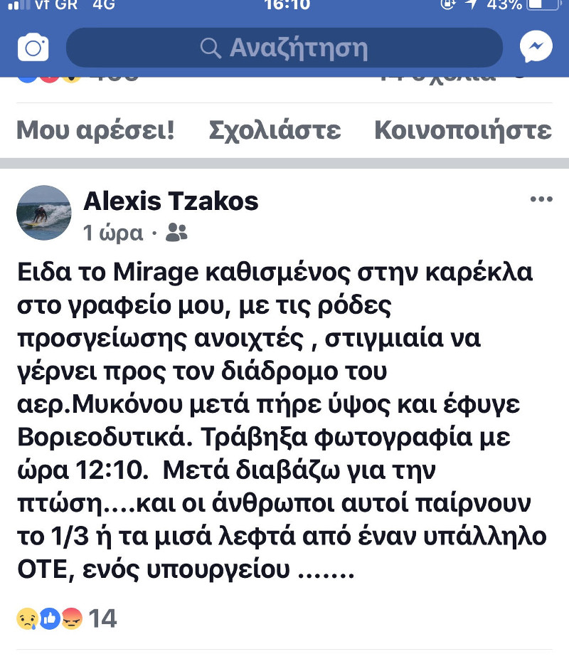 «Ειδα το Μιράζ από την καρέκλα του γραφείου μου που έχει ορατότητα προς το αεροδρόμιο Μυκόνου. Πετούσε χαμηλά και είχε βγάλει τις ρόδες σαν να προσπαθούσε να προσγειωθεί. Τελικά έκανε τουλάχιστον έναν γύρο πάνω από το νησί και έφυγε. Ολοι καταλάβαμε ότι κάτι δεν πήγαινε καλά .Προσπάθησα να τραβήξω και βιντεο αλλά δεν πρόλαβα. Η ώρα ήταν 12:10. Λίγη ώρα αργότερα μάθαμε οτι έπεσε», ανέφερε ο κ.Τζακος.