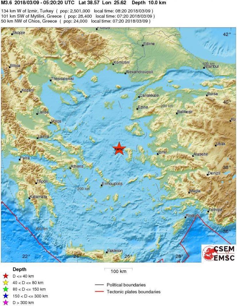 Ασθενής σεισμική δόνηση μεγέθους 3,6 βαθμών της κλίμακας Ρίχτερ (σύμφωνα με την αυτόματη λύση του EMSC), σημειώθηκε σήμερα το πρωί, Παρασκευή (9/3) στις 07:20, στην υποθαλάσσια περιοχή, κοντά στις ανατολικές ακτές των Ψαρών.