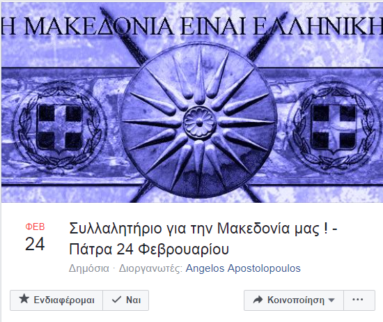 Η πρόσκληση γίνεται μέσω facebook στη σελίδα των εκδηλώσεων, με τίτλο: "Συλλαλητήριο για την Μακεδονία μας! – Πάτρα 24 Φεβρουαρίου". Στη σελίδα απευθύνεται κάλεσμα σε πολίτες και τοπικούς φορείς να στηρίξουν το συλλαλητήριο, το οποίο προγραμματίζεται να γίνει το Σάββατο 24 Φεβρουαρίου, στις 5 μ.μ., στην πλατεία Γεωργίου.