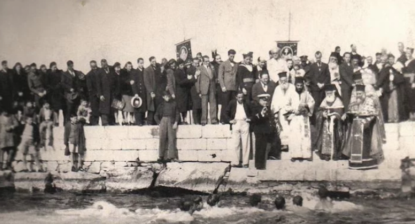 Ερμιόνη. Με τους επίσημους στην προβλήτα και τα νιάτα να βουτούν για τον Σταυρό. Ο πρώτος νεαρός φαίνεται να κρατά μια εικόνα…