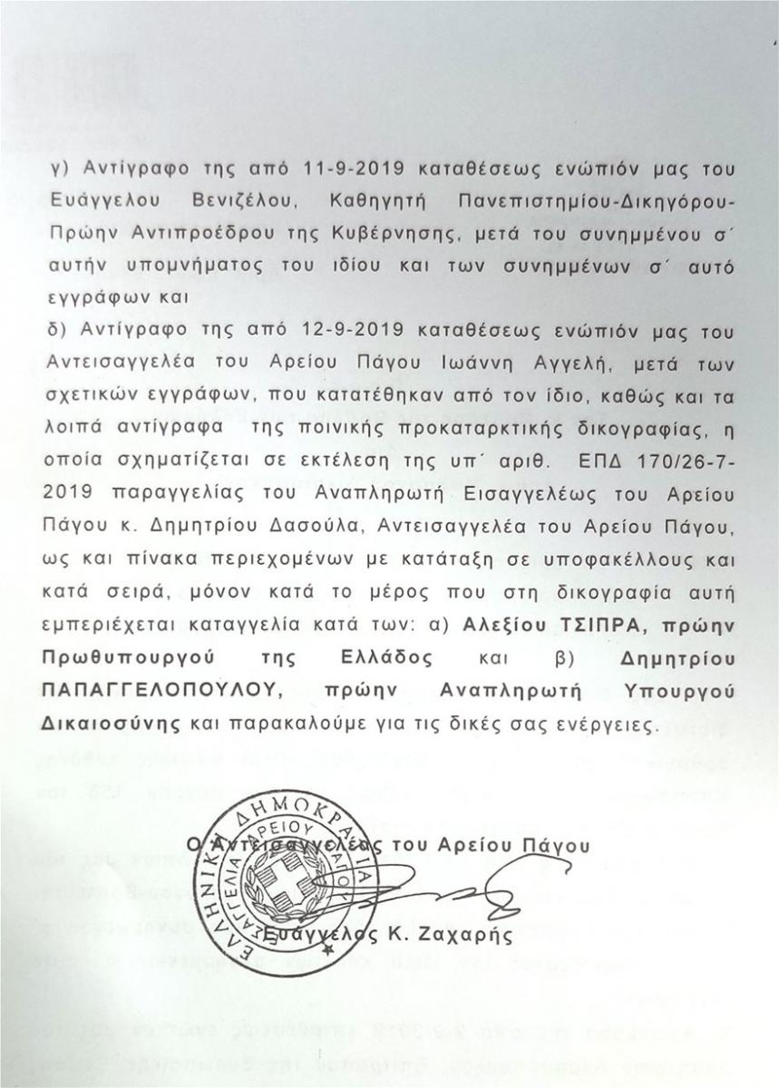 δ) αντίγραφο της από 12.9.2019 καταθέσεως ενώπιόν μας του Αντεισαγγελέα του Αρείου Πάγου Ιωάννη Αγγελή, μετά των σχετικών εγγράφων, που κατατέθηκαν από τον ίδιο, καθώς και τα λοιπά αντίγραφα της ποινικής προκαταρκτικής δικογραφία, η οποία σχηματίζεται σε εκτέλεση της υπ. Αριθ. ΕΠΔ 170/26-7-2019 παραγγελίας του Αναπληρωτή Εισαγγελέως του Αρείου Πάγου κ. Δημητρίου Δασούλα, Αντεισαγγελέα του Αρείου Πάγου, ως και πίνακα περιεχομένων με κατάταξη σε υποφακέλλους και κατά σειρά, μόνον κατά το μέρος που στη δικογραφία αυτή εμπεριέχεται καταγγελία κατά των α) Αλεξίου Τσίπρα, πρώην πρωθυπουργού της Ελλάδας και β) Δημητρίου Παπαγγελόπουλου, πρώην αναπληρωτή υπουργού Δικαιοσύνης και παρακαλούμε για τις δικές σας ενέργειες».