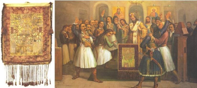 Από τη θέση αυτή, ο Αρχιεπίσκοπος Παλαιών Πατρών Γερμανός «άρπαξε» το κεντημένο Παραπέτασμα, για να το προτείνη σαν Σημαία του Αγώνα κατά τη συνεχιζόμενη σύσκεψη των Οπλαρχηγών και των Προκρίτων της περιοχής. Ώρισε μάλιστα σαν Σημαιοφόρο, τον Ιεροδιάκονο Γρηγόριο Ντόκο. Αφού λοιπόν ο Αρχιεπίσκοπος έλαβε στα χέρια του το Παραπέτασμα της Ωραίας Πύλης -Λάβαρο- το ευλόγησε και στη συνέχεια με ζωηρά πατριωτικά λόγια κάλεσε όλους όσους βρίσκονταν εκεί, Άρχοντες και Οπλαρχηγούς να βάλουν το χέρι τους πάνω στην «Ιερά Σημαία» να ορκισθούν όρκο ιερό και να βεβαιώσουν, ότι θα πολεμήσουν μέχρι της τελευταίας σταγόνας του αίματος τους, έως ότου ελευθερώσουν την Πατρίδα από τον Τούρκο κατακτητή.