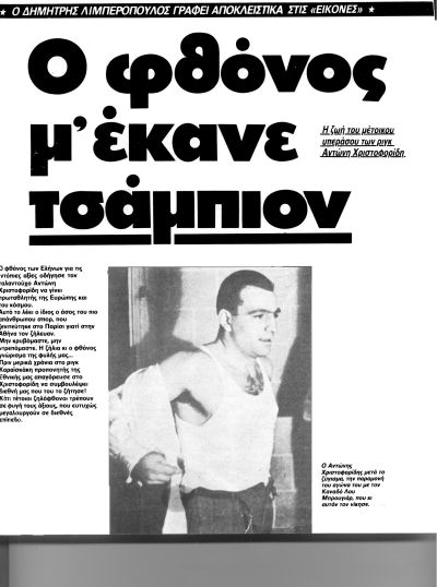 «Στη διάρκεια του αγώνα, ούτε μια στιγμή δεν ακούστηκε μια ενθαρρυντική φωνή για τον Αντώνη. Όλοι ούρλιαζαν για τον δικό τους. Κι όμως, ο δικός μας, απτόητος, δεχόταν κι ανταπέδιδε τα χτυπήματα και, όπως ήξερα, σκεφτόταν πως αν έχανε εκείνο το παιχνίδι θα του έφραζαν το δρόμο για τον ευρωπαϊκό τίτλο. Και δεν κιότεψε. Ούτε για μια στιγμή δεν έχασε την ψυχραιμία του και το στιλ του κι οι ελάχιστοι Έλληνες που τον βλέπαμε κλαίγαμε από συγκίνηση, καθώς γύρο με γύρο μάζευε βαθμούς.