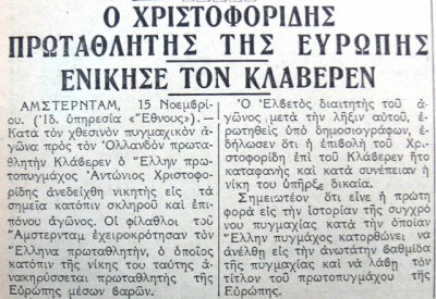 Αργότερα ο Αντώνης Χριστοφορίδης, παιδί προσφύγων από τη Μικρά Ασία, έφυγε για την Αμερική, να κυνηγήσει το όνειρό του. Να γίνει παγκόσμιος πρωταθλητής. Από ένα παιχνίδι της μοίρας τα κατάφερε στις 22 Νοεμβρίου του 1940, την ημέρα που ο ελληνικός στρατός κυνηγούσε τους Ιταλούς στην Αλβανία, εκείνος νικούσε στο Κλίβελαντ έναν Ιταλοαμερικάνο, τον Μέλιο Μπετίνα.