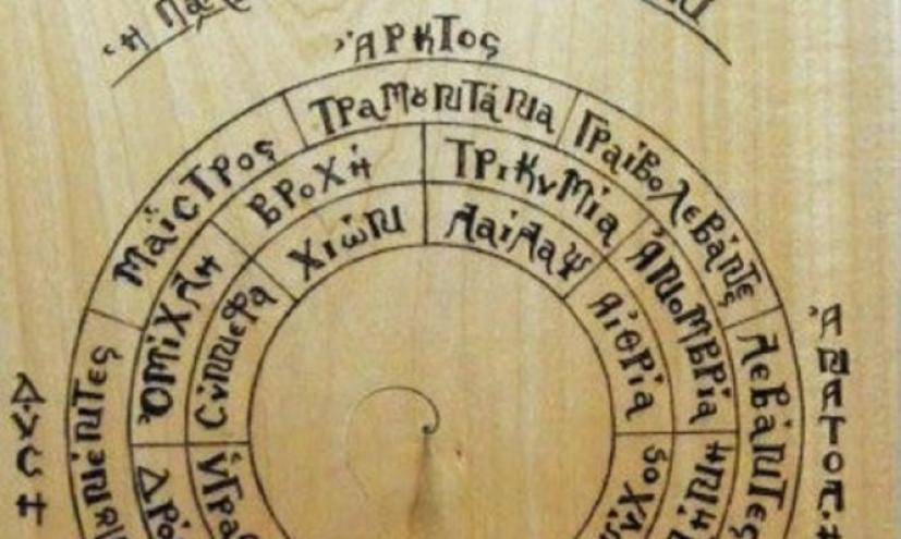 Οι έξω κύκλοι δείχνουν τις ονομασίες των ανέμων και οι εσωτερικοί κύκλοι δείχνουν τα χειμερινά καιρικά φαινόμενα.