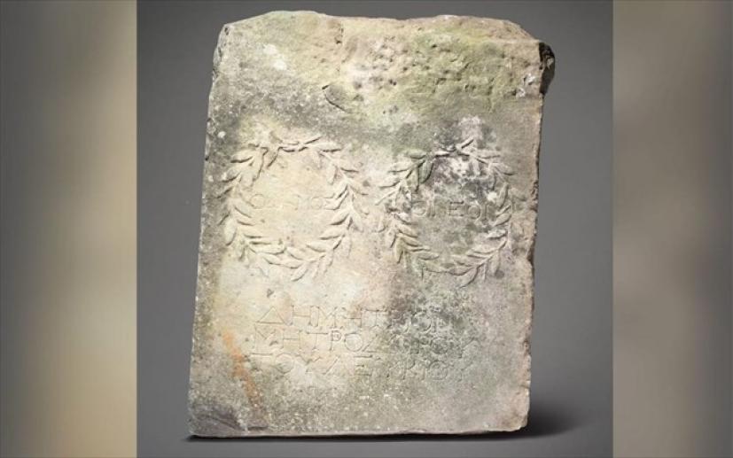 Στην πλάκα είναι χαραγμένη μια ελληνική επιγραφή, δίνοντας στοιχεία για την προέλευσή της και χρονολογείται από τον δεύτερο αιώνα μ.Χ.. Η επιγραφή λέει: «Ο δήμος (και) οι νέοι (τιμούν) τον Δημήτριο του Μητροδωρου του Λεύκιου».