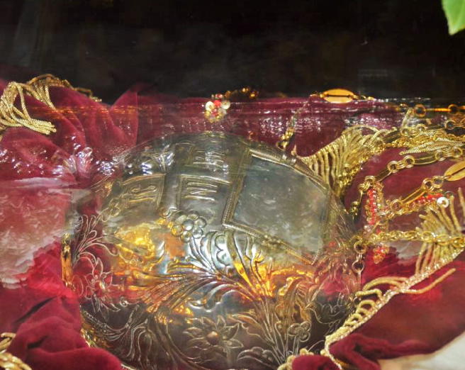 | Το σκήνωμα του Αγίου Γρηγορίου του Παλαμά, Αρχιεπισκόπου Θεσσαλονίκης. Διακρίνεται η λειψανοθήκη με την Τιμία Κάρα του Αγίου. |