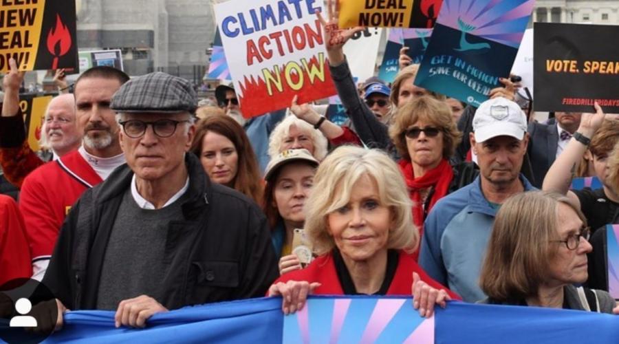 Η διάσημη αμερικανίδα ηθοποιός Τζέιν Φόντα, φορώντας το αναγνωρίσιμο κόκκινο πανωφόρι της, συνελήφθη για τέταρτη φορά μέσα σε ένα μήνα διαδηλώνοντας ενάντια στην απραξία των πολιτικών στις ΗΠΑ για την κλιματική αλλαγή.