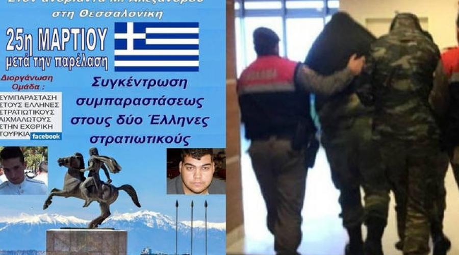 Συγκέντρωση συμπαράστασης στους δυο Έλληνες στρατιωτικούς που παραμένουν φυλακισμένοι επί 16 μέρες στις φυλακές υψίστης ασφαλείας της Αδριανούπολης, διοργανώνεται την Κυριακή 25 Μαρτίου στη Θεσσαλονίκη.
