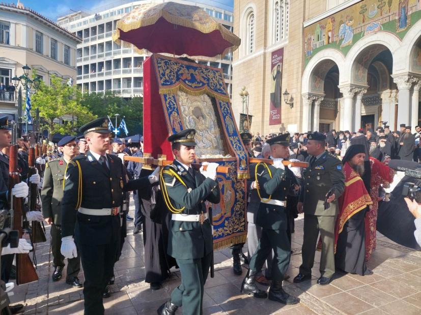 Mε τιμές αρχηγού κράτους υποδέχεται αυτή τη στιγμή ο κλήρος και ο λαός της Αθήνας, την θαυματουργή εικόνα Άξιον Εστί.