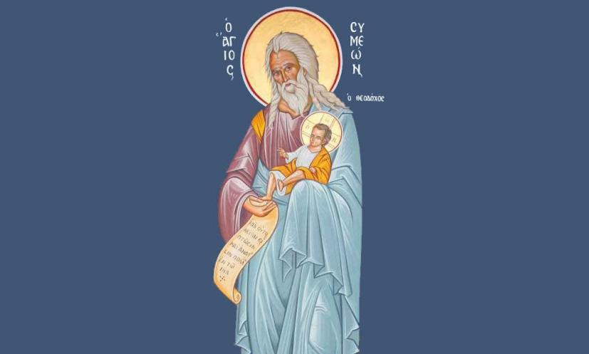 Σύμφωνα με τον συναξαριστή, ο Συμεών κατοικούσε στην Ιερουσαλήμ. Ήταν δίκαιος, ευλαβής και φωτισμένος από το Άγιο Πνεύμα, που του είχε φανερώσει ότι δε θα πέθαινε πριν δει το Χριστό. Η χαρμόσυνη αυτή πληροφορία τον εμψύχωνε ως τα βαθειά γεράματα του. Τέλος, ακριβώς σαράντα μέρες μετά τη γέννηση του Ιησού, το Πνεύμα τον πληροφόρησε ότι έπρεπε να πάει στο Ιερό. Ετοιμάστηκε, λοιπόν, με νεανική ζωηρότητα, πήγε εκεί και στάθηκε στην πόρτα, γεμάτος ευχαρίστηση και αγαλλίαση. Μέσα στην προσδοκία αυτή, φάνηκαν να έρχονται ο Ιωσήφ με την Παρθένο, που κρατούσε τον Ιησού. Ο Συμεών, πληροφορημένος από το Πνεύμα ότι το βρέφος αυτό είναι ο Χριστός, τρέχει και παίρνει τον Ιησού στην αγκαλιά του. Τον κρατάει ευλαβικά και, αφού καλά - καλά παρατήρησε το νήπιο και δέχθηκε όλη την ιλαρότητα της θείας μορφής του, ύψωσε το βλέμμα του επάνω και είπε ευχαριστώντας το Θεό: «Νυν απολύεις τον δούλον σου, Δέσποτα, κατά το ρήμα σου εν ειρήνη· ότι είδον οι οφθαλμοί μου το σωτήριόν σου, ο ητοίμασας κατά πρόσωπον πάντων των λαών, φως εις άποκάλυψιν εθνών και δόξαν λάου σου Ισραήλ». Τώρα, δηλαδή, πάρε την ψυχή μου Δέσποτα, σύμφωνα με το λόγο σου, ειρηνικά, διότι τα μάτια μου είδαν αυτόν που θα φέρει τη σωτηρία που ετοίμασες για όλους τους λαούς και θα είναι γι' αυτούς φως, που θα αποκαλύψει τον αληθινό Θεό και θα δοξάσει το λαό σου Ισραήλ.