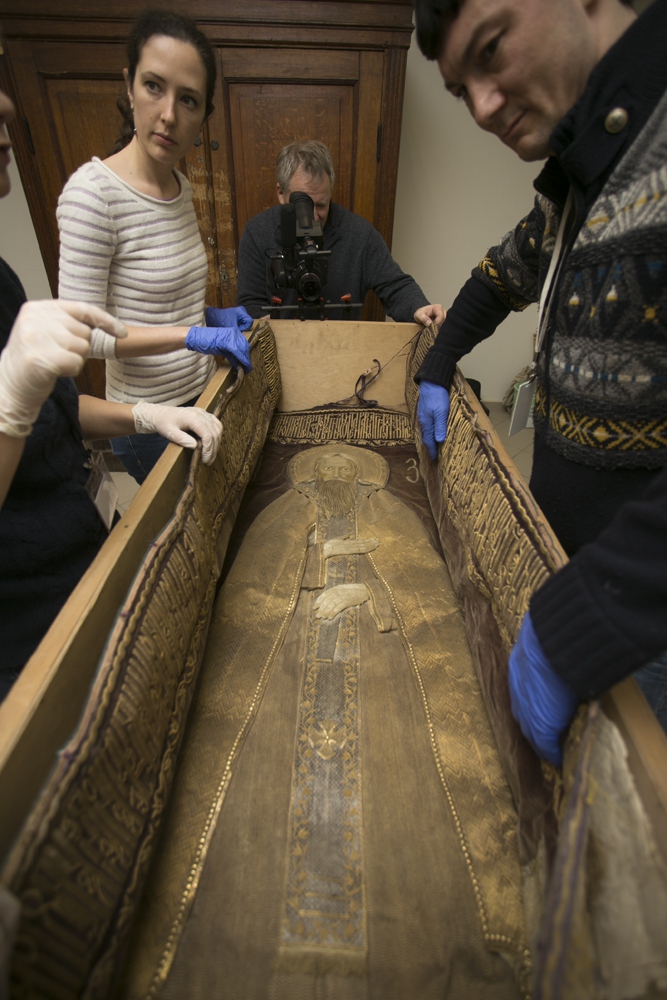Όπως αναφέρεται, κατά τη διάρκεια των εργασιών στα αρχεία του Επιστημονικού Ινστιτούτου και του μουσείου Ανθρωπολογίας του Κρατικού Πανεπιστημίου Λομονόσοφ της Μόσχας οι επιστήμονες με επικεφαλής την κ. Αλεξάνδρα Μουζίλοβα ανακάλυψαν το χρυσοκέντητο κάλυμμα με εικόνα του Αγίου Ζωσιμά, ιδρυτή της Ιεράς Μονής στις νήσους Σολόβκι. Τα λείψανα του Αγίου Ζωσιμά μετά το 1925 βρίσκονταν υπό την κατοχή της υπηρεσίας NKVD (Εθνικής Υπηρεσίας Ασφαλείας της ΕΣΣΔ) ενώ ύστερα παραδόθηκαν στο Αντιθρησκευτικό Μουσείο, όπου και παρέμεινα μέχρι το 1939 από όπου μεταφέρθηκαν στο μουσείο της θρησκείας του αθεϊσμού στο Λενινγκράντ. Το 1990 τα λείψανα επέστρεψαν στο μοναστήρι, αλλά η τύχη του καλύμματος παρέμεινε άγνωστη μέχρι σήμερα.