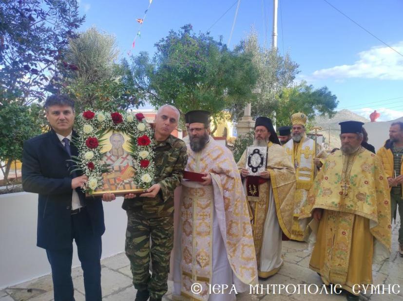 Την κυριώνυμο ημέρα της εορτής, ο Σεβασμιώτατος Μητροπολίτης Σύμης κ. Χρυσόστομος χοροστάτησε στον Όρθρο, τέλεσε την Θεία Λειτουργία και ευηγγελίσθηκε τον θείο λόγο στους πιστούς, έχοντας συλλειτουργούς του τον Πανοσιολ. Καθηγούμενο της Ιεράς Μονής Πανορμίτη Αρχιμανδρίτη Αντώνιο Πατρό, τον Γεν. Αρχιερατικό Επίτροπο Πρωτοπρ. Στέφανο Μακρή, τον Εφημέριο του Ιερού Ναού Αγίας Τριάδος π. Γεώργιο Χατζηχρυσάφη, τον Εφημέριο του εορτάζοντος Ιερού Ναού Οικονόμο π. Ελευθέριο Οθίτη και τον Διάκονο π. Γεώργιο Κακακιό.