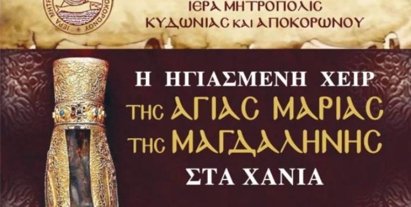 Tο άφθαρτο χέρι της Ευαγγελίστριας της Αναστάσεως Αγίας Μυροφόρου Μαρίας της Μαγδαληνής που φυλάσσεται στην Ιερά Μονή Σίμωνος Πέτρας του Aγίου Όρους θα υποδεχθεί η Ιερά Μητρόπολη Κυδωνίας.